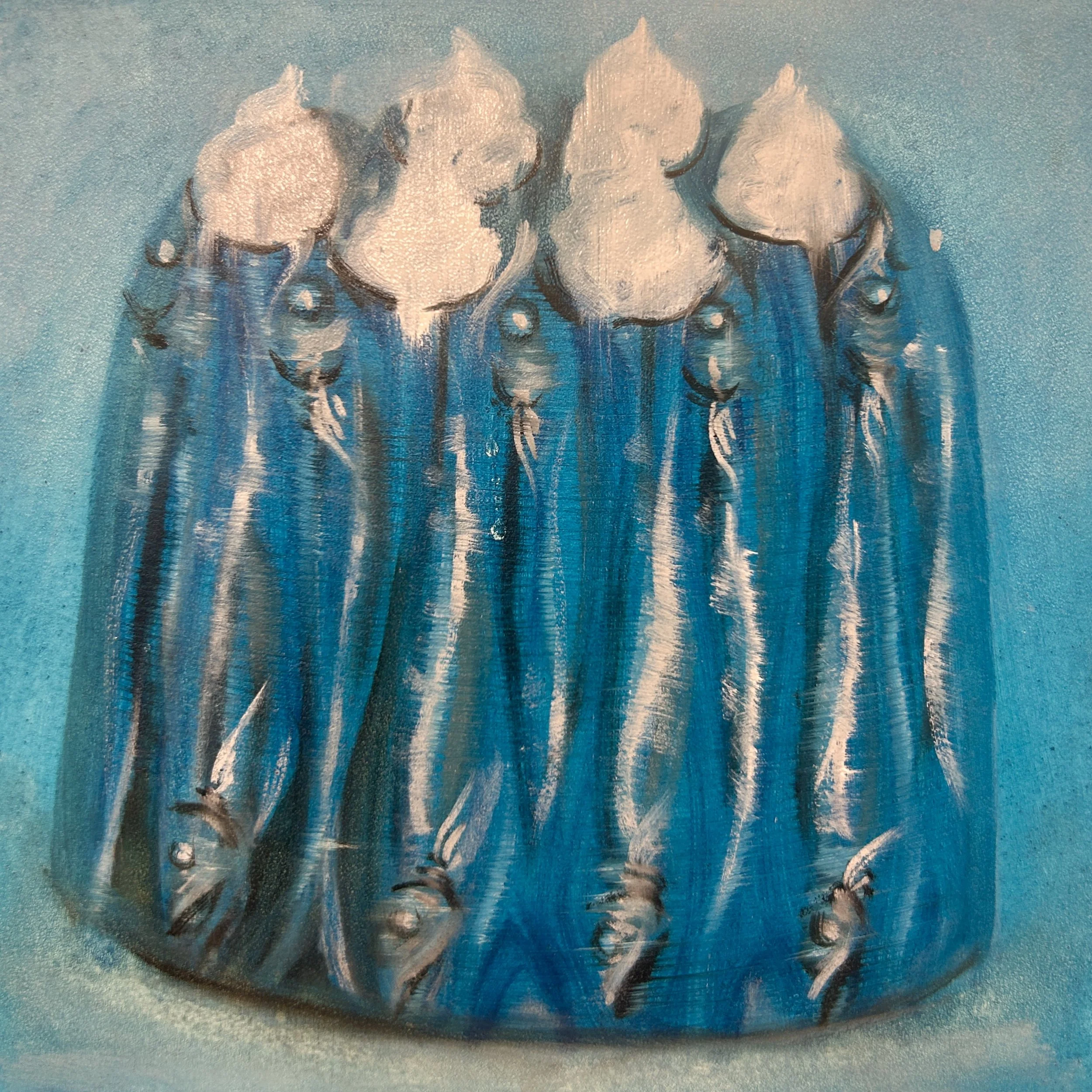 Sardine Aspic (Blue), 2025, oil on panel, 6 x 6 inches