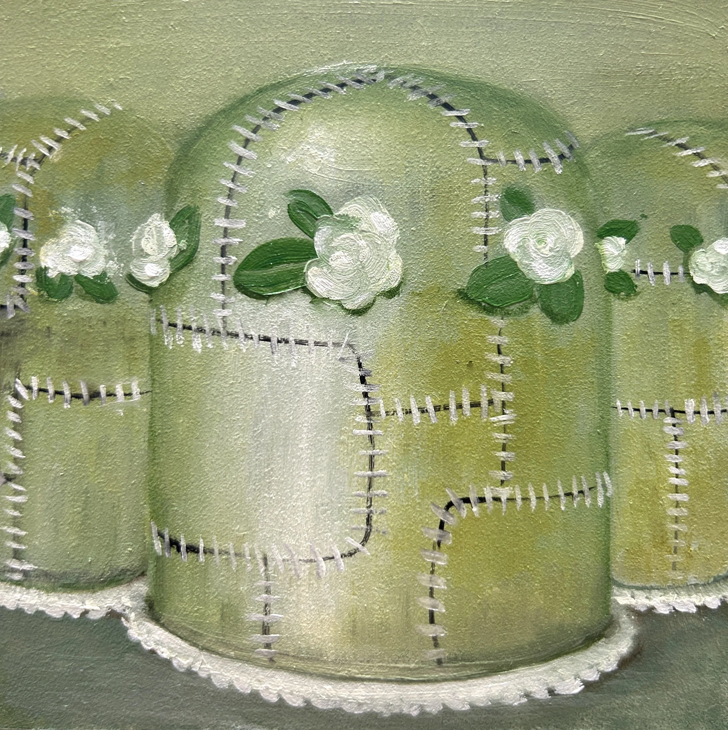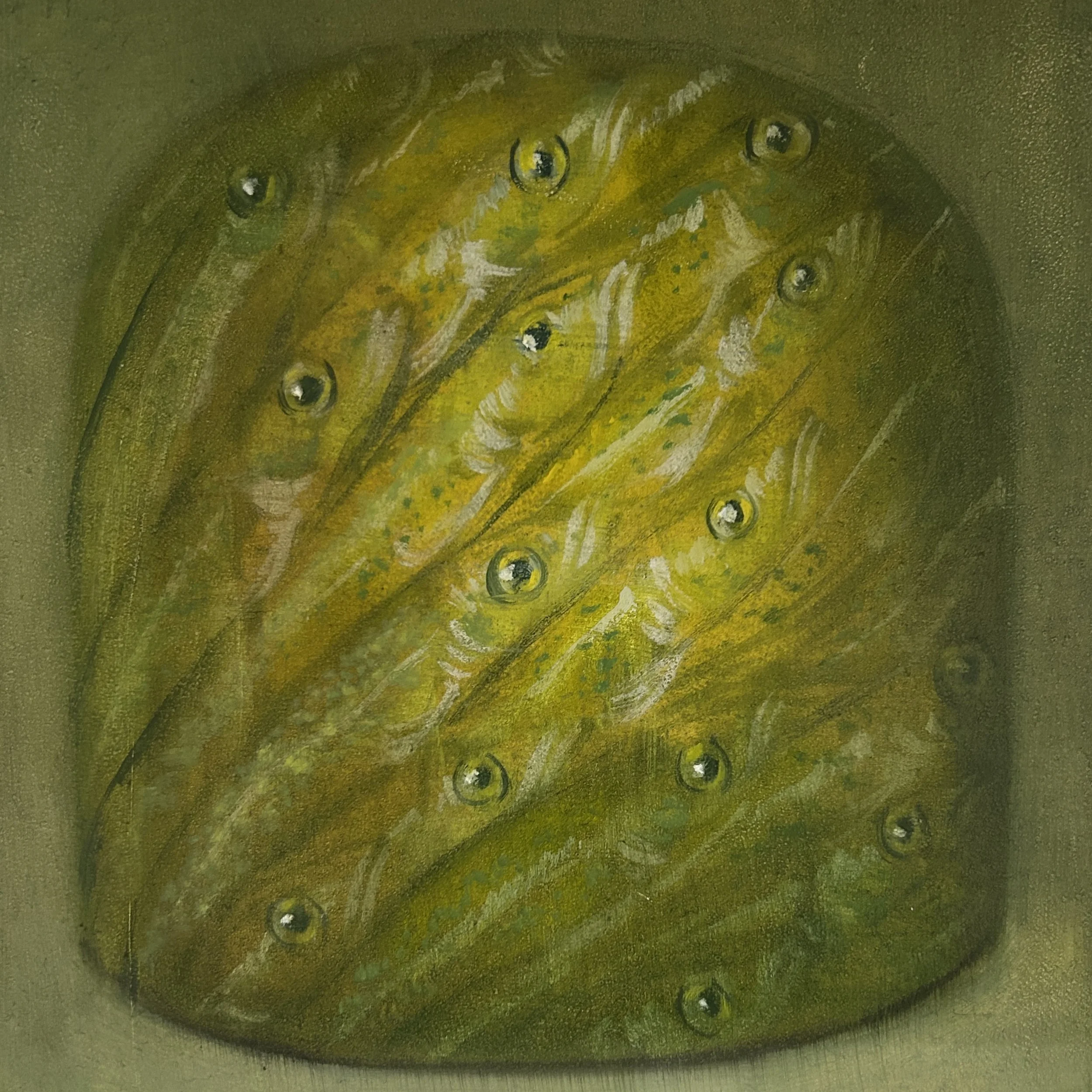 Sardine Aspic (Green), 2025, oil on panel, 6 x 6 inches, $500