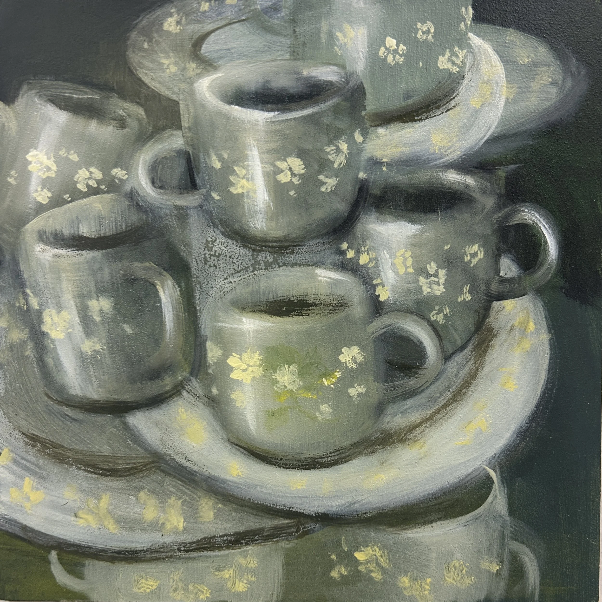 Teacups and Saucers, 2025, oil on panel, 6 x 6 inches
